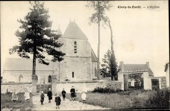 Ak Civry-la-Forêt Yvelines, L'Eglise, vue générale, groupe d'enfants