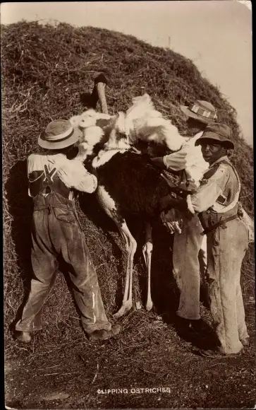 Ak Clipping Ostriches, Strauße schneiden, drei Männer