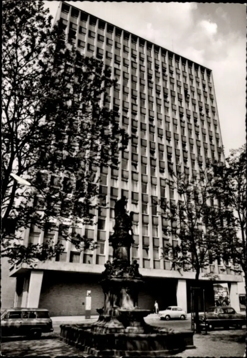 Ak Cöln Köln am Rhein, Neues Polizeipräsidium, Statue, Bäume, Autos