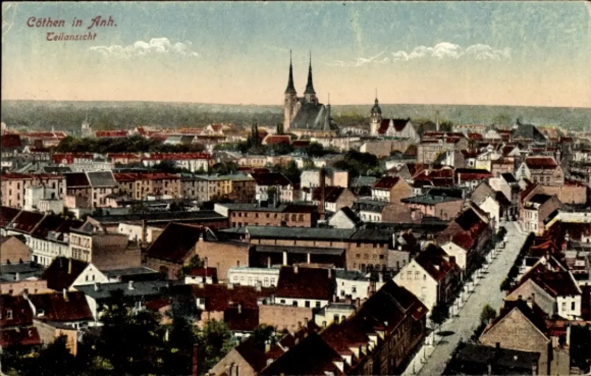 Ak Cöthen Köthen in Anhalt, Stadtansicht alte Gebäude, Kirche im Hintergrund