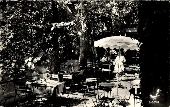 Ak Cognac Charente, 黑白照片,露台,树木,桌子,椅子,遮阳伞,两个人