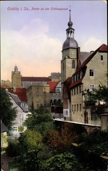 Ak Colditz in Sachsen, Kirchturm, Partie an der Schlossgasse