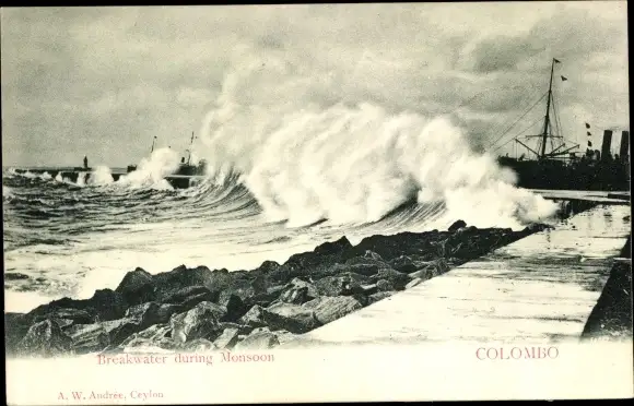 Ak Colombo Ceylon Sri Lanka, Breakwater during Monsoon