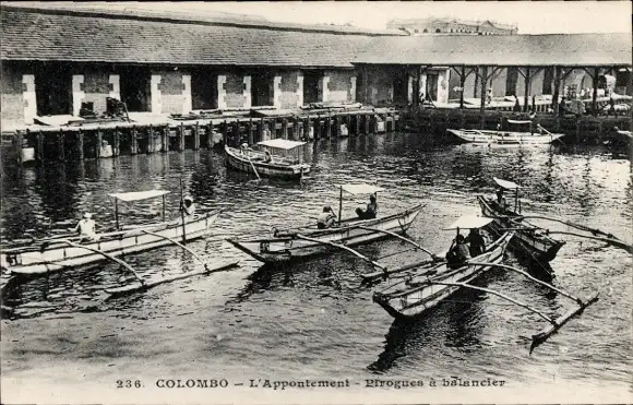 Ak Colombo Sri Lanka, The Pier, Auslegerkanus