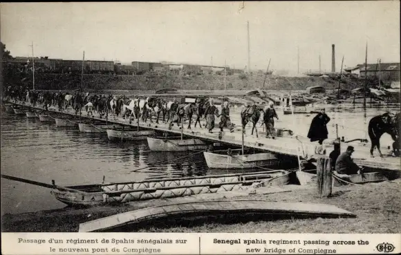 Ak Compiègne Oise, Senegal spahis regiment passing across the new bridge