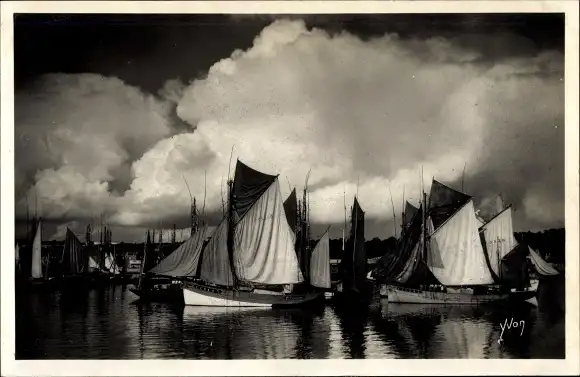 Ak Concarneau Finistère, Groupe de thonniers par ciel d'orage