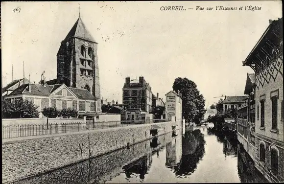 Ak Corbeil Essonne, Vue sur l'Essonnes et l'Eglise