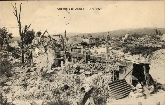 Ak Corbeny Aisne, Chemin des Dames, zerstörte Häuser