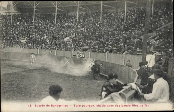 Ak Corrida de Toros, Toro peureux, chatie with the banderilles de feu