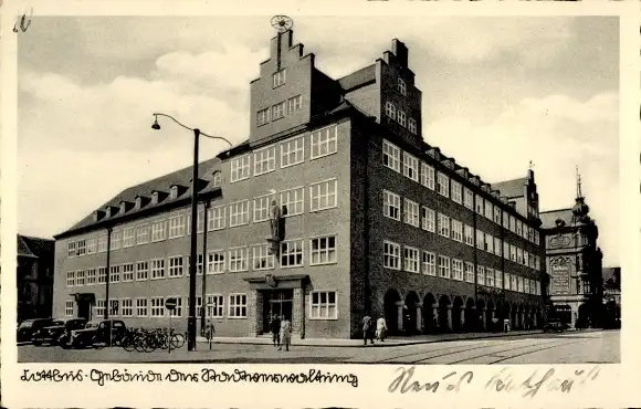 Ak Cottbus Brandenburg, Gebäude der Rentenversicherung, Autos, Fahrräder