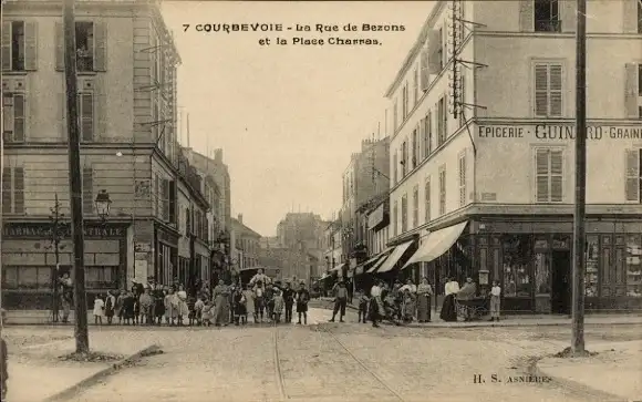 Ak Courbevoie Hauts de Seine, 7 La Rue de Bezons, Place Charras, alte Straßenansicht