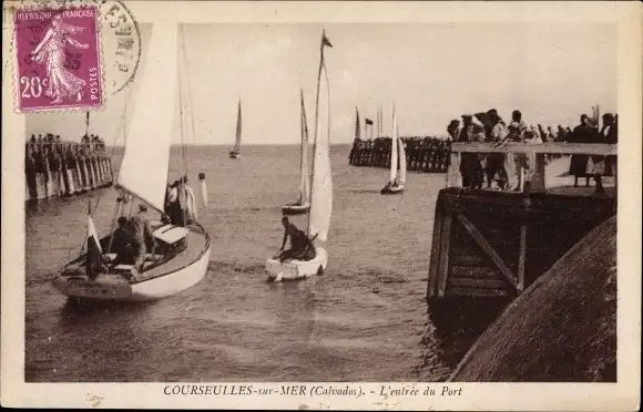 Ak Courseulles sur Mer Calvados, l' entrée du Port, Segeljollen, Zuschauer