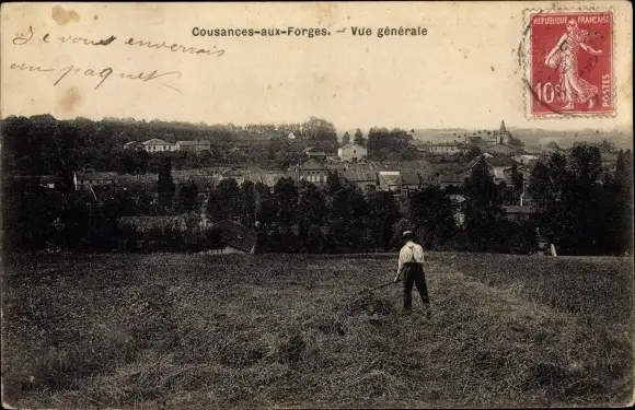 Ak Cousances les Forges Meuse, Vue générale, Sensenmann bei der Arbeit