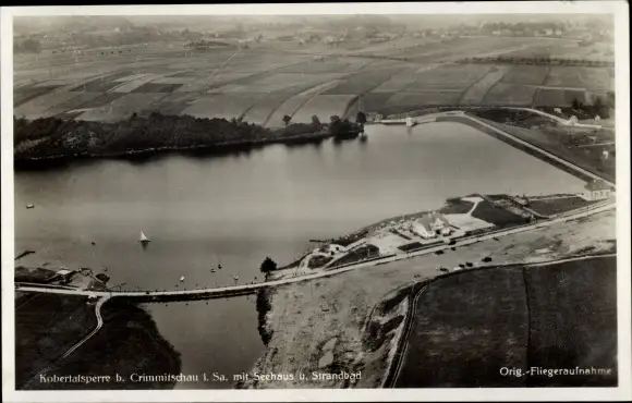 Ak Crimmitschau in Sachsen, Kobertalsperre, Seehaus, Strandbad, Fliegeraufnahme