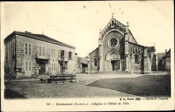 Ak Cuiseaux Saône et Loire, L'Église et l'Hôtel de Ville