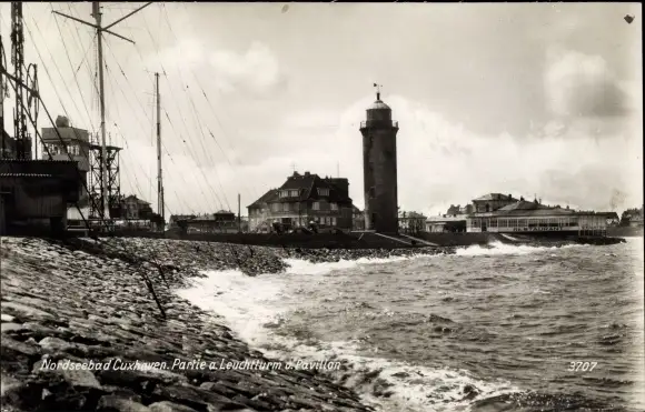Ak Cuxhaven, Leuchtturm und Pavillon