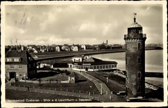 Ak Cuxhaven, Leuchtturm und Seedeich