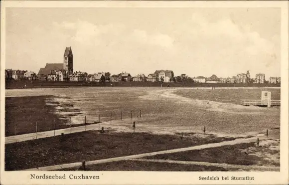 Ak Cuxhaven, Seedeich bei Sturmflut, Blick auf den Ort