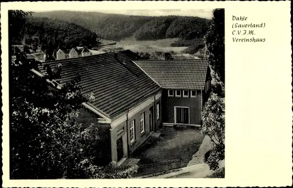 Ak Dahle Altena im Sauerland, CVJM Vereinshaus, Panoramaansicht, Wohnhäuser, Wald