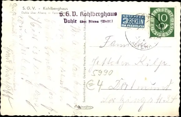 Ak Dahle Altena im Sauerland, S.G.V. Kohlberghaus
