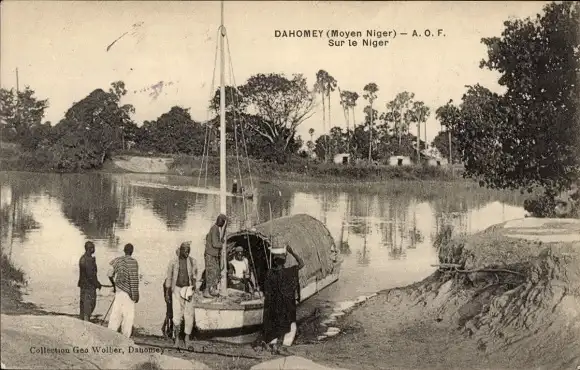 Ak Dahomey Benin, Boot auf dem Niger, Männer am Ufer, grüne Umgebung, historische Ansicht