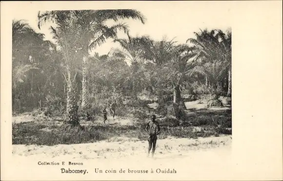 Ak Dahomey Benin, Un coin de brousse a Ouidah, Palmen, Menschen