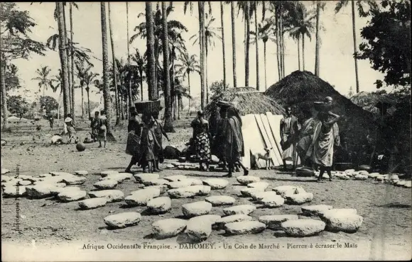 Ak Dahomey Benin, Westafrika, eine Ecke des Marktes, Steine, um Mais zu zerkleinern