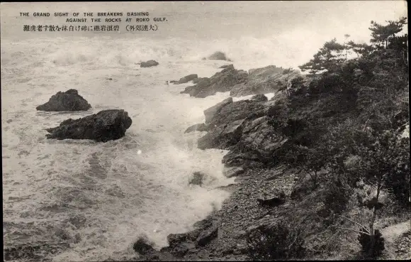 Ak Dalian Dairen China, Breakers dashing against the rocks at Roko Gulf