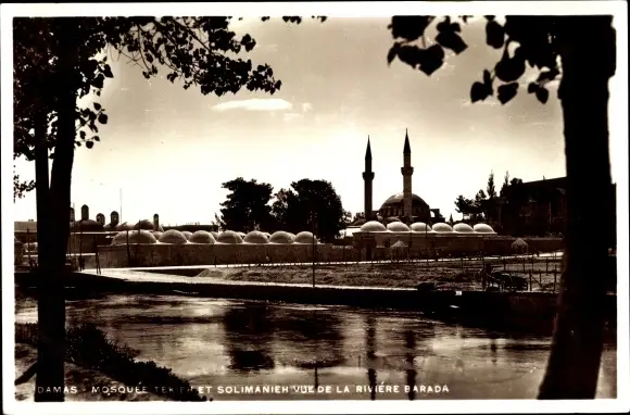 Ak Damas Damaskus Syrien, Mosquee Tekieh et Solimanieh vue de la Rinere Barada
