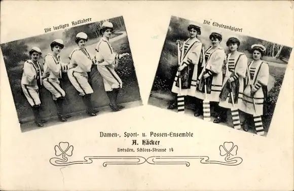 Ak Damen- Sport- und Possen-Ensemble A. Häcker, Dresden, Die lustigen Radfahrer, Elbstrandgigerl