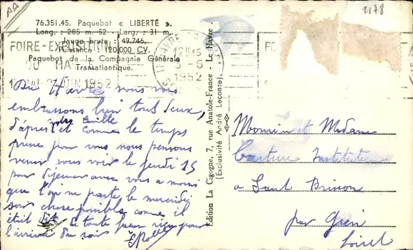 Zustand, siehe Scan, gelaufen, 1952 - ca 14 cm X 9 cm