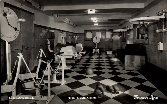 Ak Dampfer MS Lafayette, CGT, French Line, Fitnessraum, Innenansicht