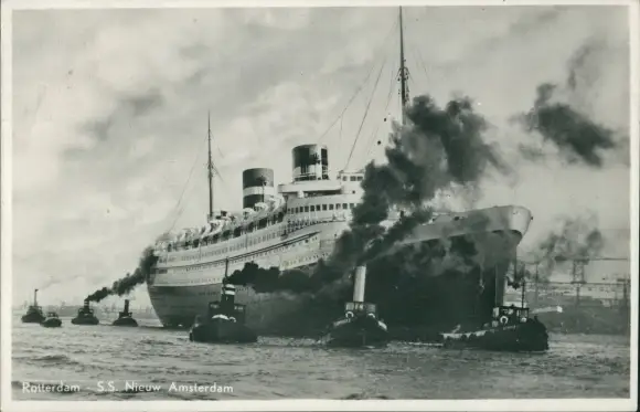 Ak Dampfer SS Nieuw Amsterdam, Holland America Line HAL, Im Hafen, Schleppschiffe