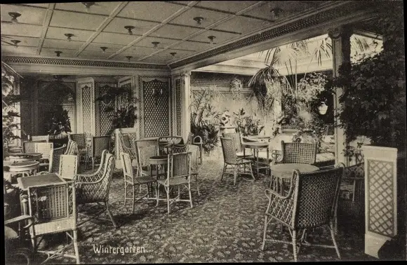 Ak Dampfer der HAPAG, Dampfschiff, Passagierschiff, Wintergarten, Innenansicht
