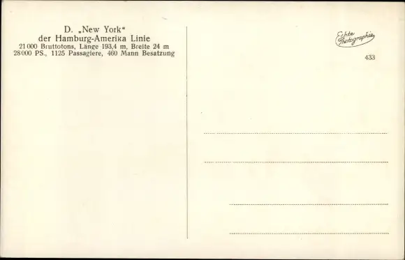 Ak Dampfschiff New York, HAPAG, Ansicht Backbord