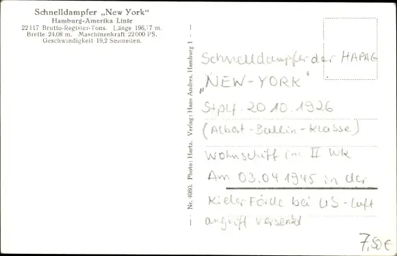 Ak Dampfschiff New York, HAPAG, Dampfer