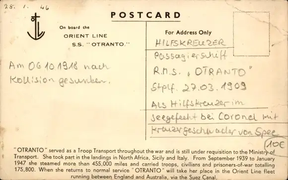 Ak Dampfschiff SS Otranto, Orient Line, Truppentransportschiff 1. WK