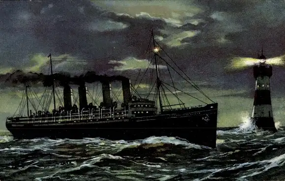 Ak Dampfschiff passiert einen Leuchtturm bei Nacht