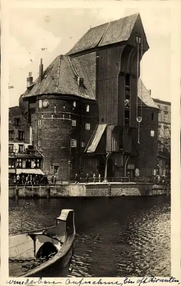 Ak Danzig, Blick auf das Krantor von links, Wasser