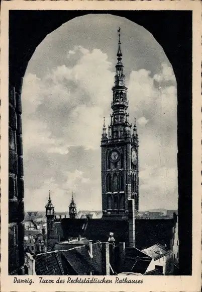 Ak Danzig, Turm des Rechtstädtischen Rathauses und der Wohnhäuser