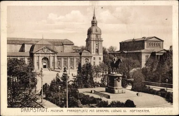 Ak Darmstadt in Hessen, Museum, Paradeplatz mit Denkmal Ludwig IV., Hoftheater