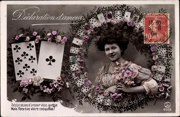 Ak Declaration d'amour, Frauenportrait, Spielkarten