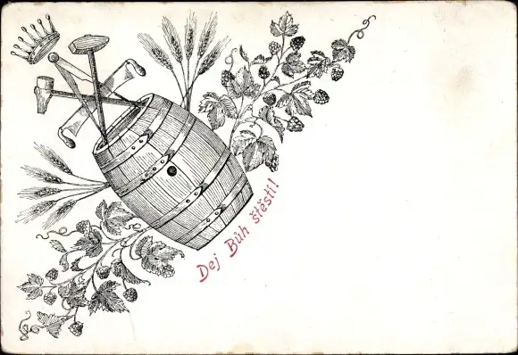 Ak Dej Buh stesti, Bierfass, Hopfen, Getreide, Hammer, Sichel