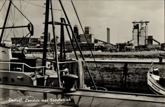 Ak Delfzijl Groningen, Zeesluis met Sodafabriek