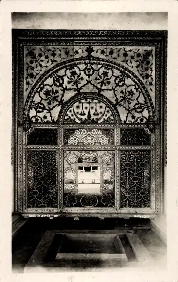 Ak Delhi Indien, Rotes Fort, verziertes Fenster
