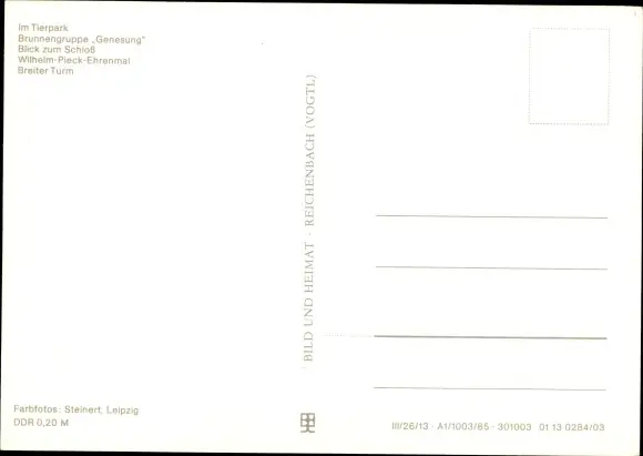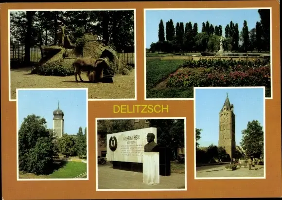 Ak Delitzsch in Sachsen, Tierpark, Brunnengruppe Genesung, Schloss, Wilhelm-Pieck-Ehrenmal