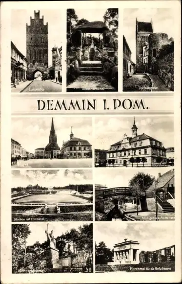 Ak Demmin in Vorpommern, Kriegerdenkmal, Stadion, Mühlgraben, Luisentor