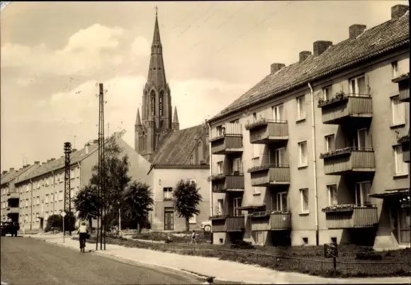 Ak Demmin in Vorpommern, Neubauten an der Frauenstraße, Kirchturm