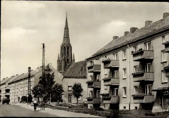 Ak Demmin in Vorpommern, Neubauten an der Frauenstraße, Kirchturm