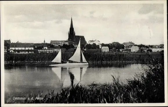 Ak Demmin in Vorpommern, Segelboot auf der Peene, Panorama, Kirche